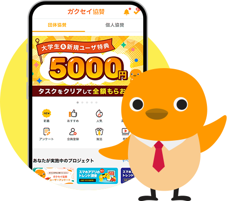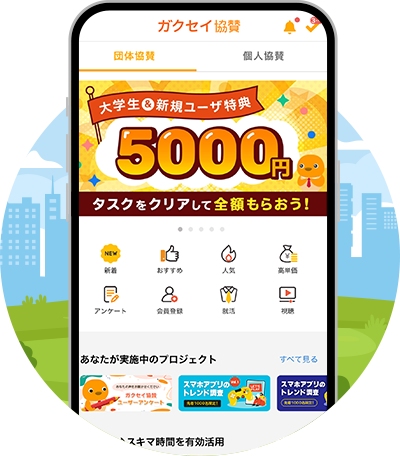 「ガクセイ協賛」は、企業のPRやマーケティング調査、サービス体験などのプロジェクトに参加し、ご協力いただいた謝礼(協賛金)を受け取れるアプリです。