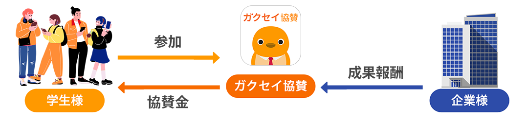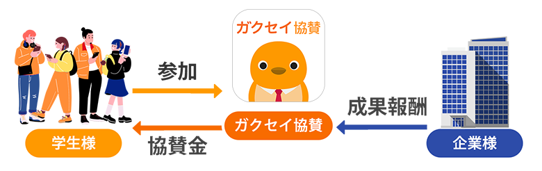 ガクセイ協賛を経由して広告を利用し、アンケートに回答する・サービスに申し込むなど、所定の成果条件が達成されると、広告主からガクセイ協賛に広告費が支払われます。この広告費の一部を、ガクセイ協賛からユーザー様へ「協賛金」として付与しています。